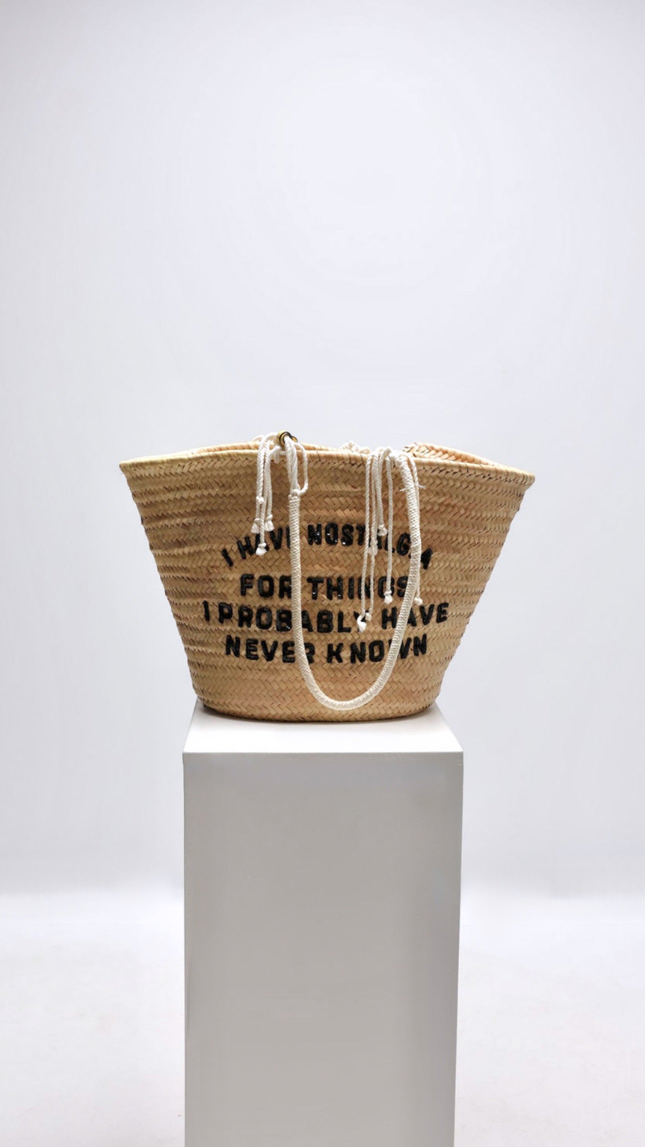 L’édition capsule signée Céline et l’artiste David Kramer, pensée comme un clin d’œil poétique aux vacances d’été. Ce panier en raphia brodé du message « I have nostalgia for things I probably have never known » mêle humour, esprit bohème et élégance désinvolte.